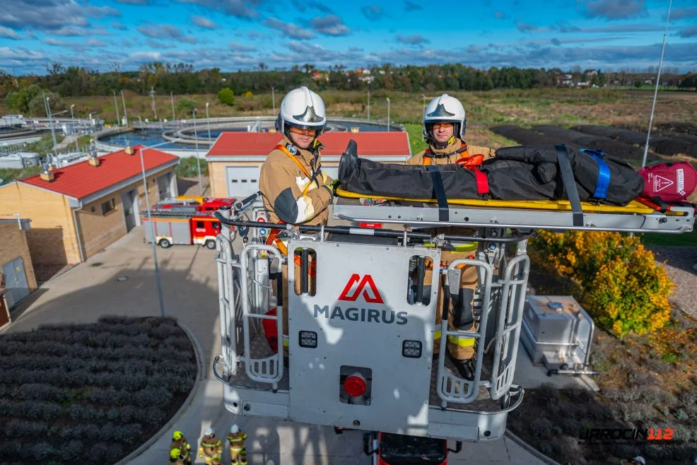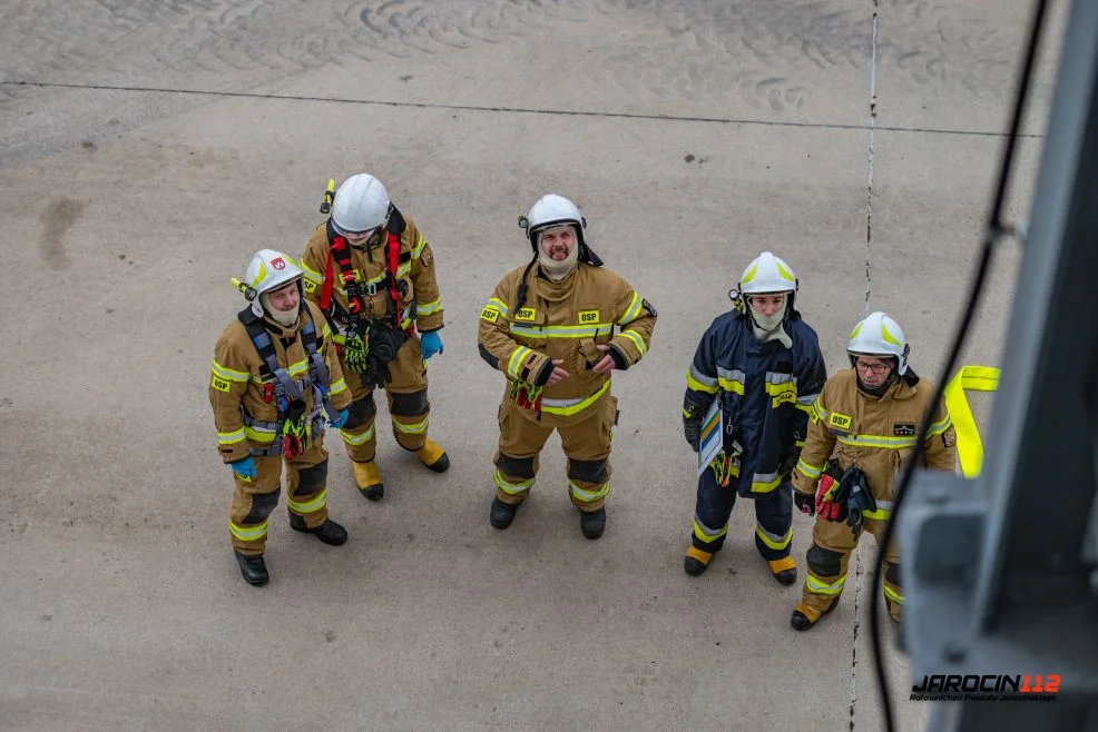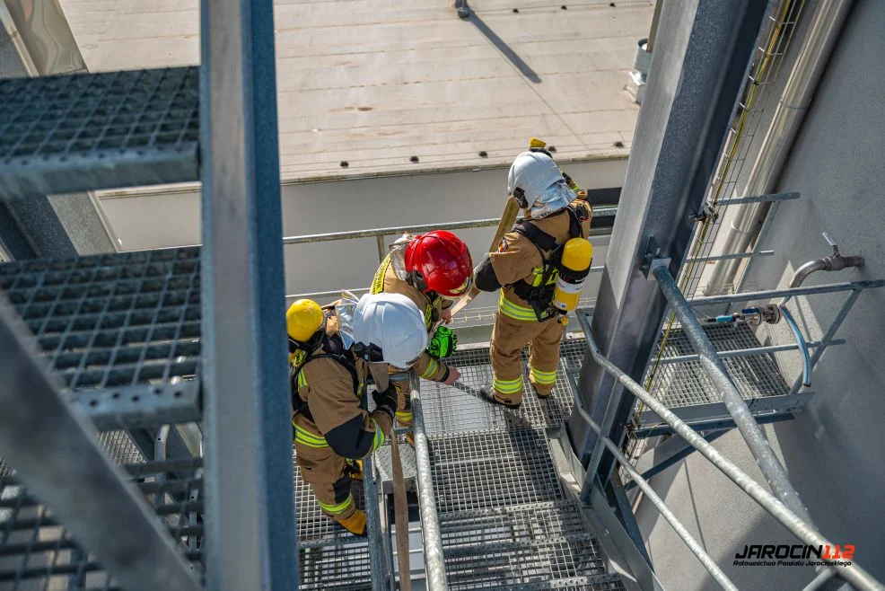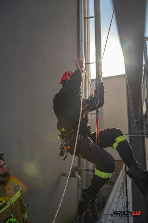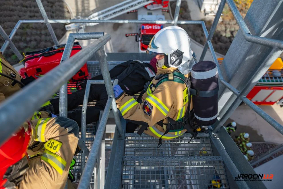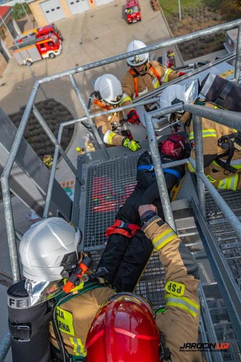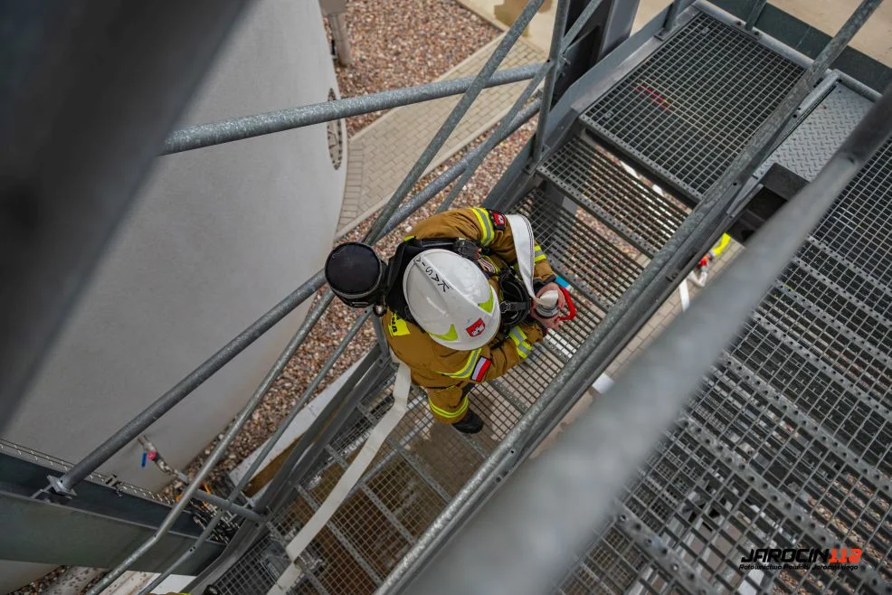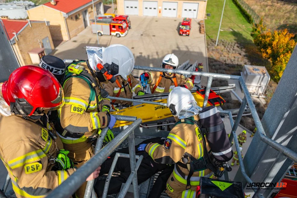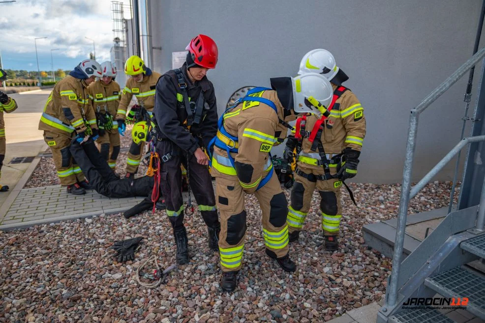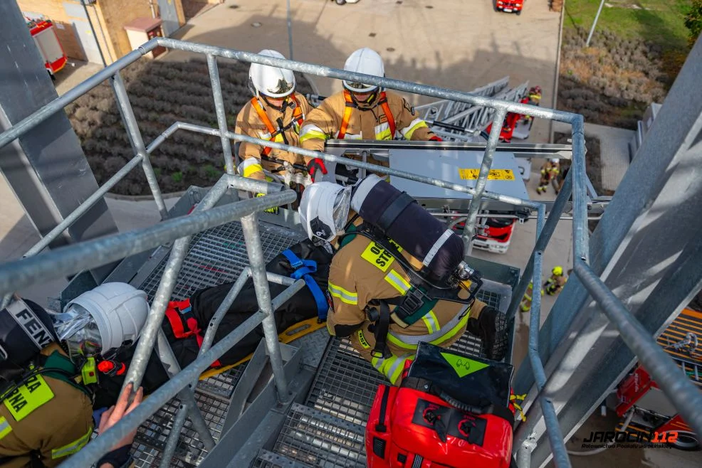 - zdarzenie wysokościowe - na dachu zbiornika symulowano wypadek z osobą poszkodowaną na wysokości 10 metrów. Strażacy udzielali kwalifikowanej pierwszej pomocy i ewakuowali poszkodowanego przy użyciu drabiny i sprzętu ratowniczego,