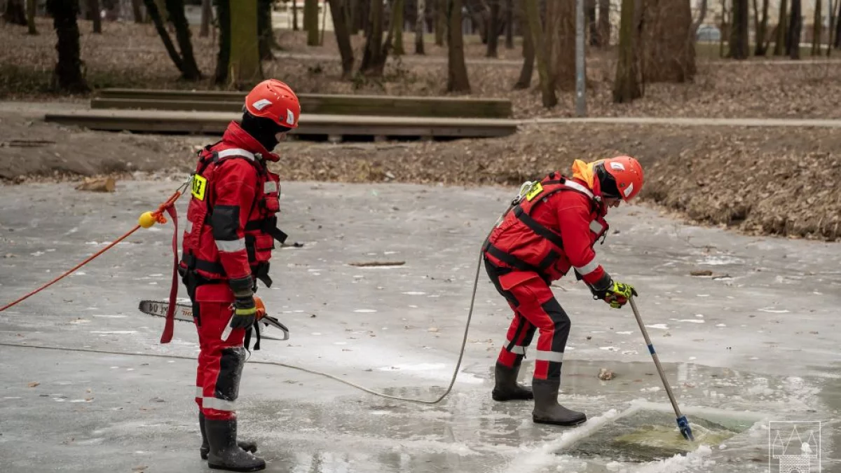 Aby natlenić zamarzniętą wodę w stawach w jarocińskich parkach, strażacy wykonali przeręble. Akcja odbywała się na stawach w parku Radolińskich i w Lasku Szubianki.