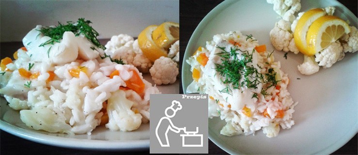 Dzielimy polędwicę dorsza na 4 lub 6 części, oprószamy solą i podsmażamy pod przykryciem przez ok. 3 minuty. Połowę rybki rozdrabniamy delikatnie, a pozostałe części pozostawiamy pod przykryciem. Kiedy ryż będzie już gotowy, wchłonie cały płyn, będzie miał trochę lejącą konsystencję, a w smaku będzie idealnie al dente, dodajemy do niego starty parmezan i łyżkę masła i dokładnie mieszamy. W razie potrzeby delikatnie solimy i posypujemy świeżo zmielonym pieprzem. Dokładamy kalafior, marchewkę i rozdrobnionego dorsza, zostawiamy na minutkę pod przykryciem, żeby risotto doszło do siebie i wszystkie składniki "złapały" swój smak. Podajemy delikatnie lejące, z kawałkiem rybki na szczycie, posypane świeżym koperkiem i ze świeżym kalafiorem w sąsiedztwie do pochrupania.