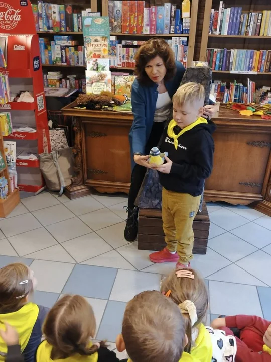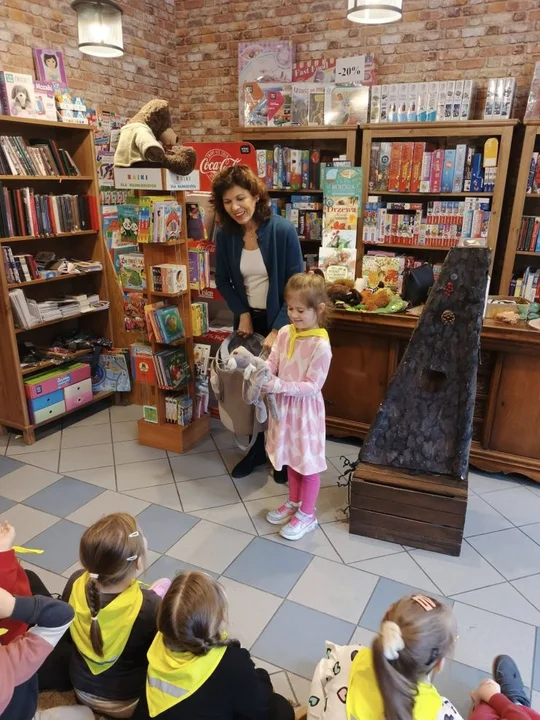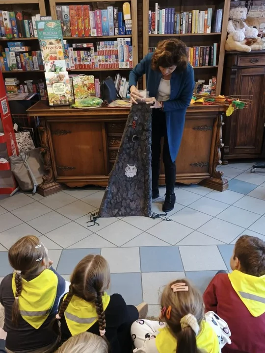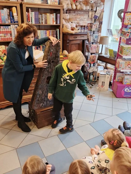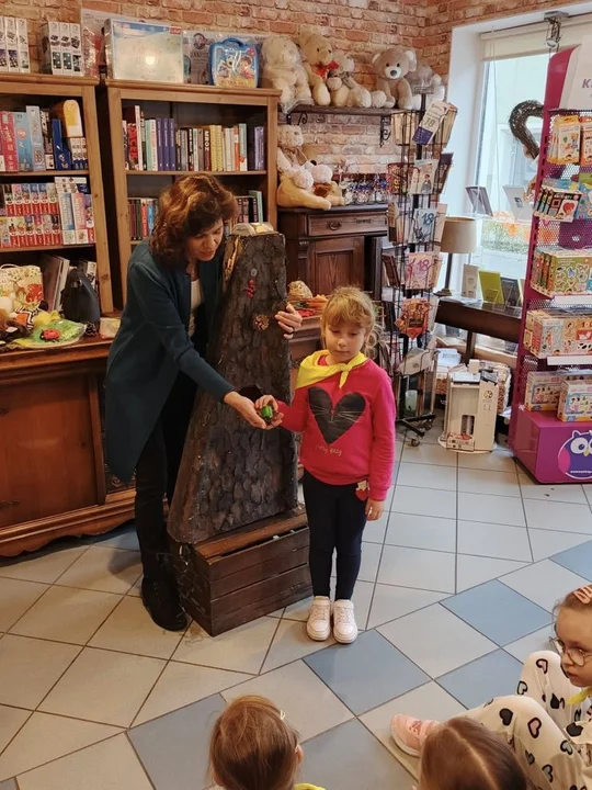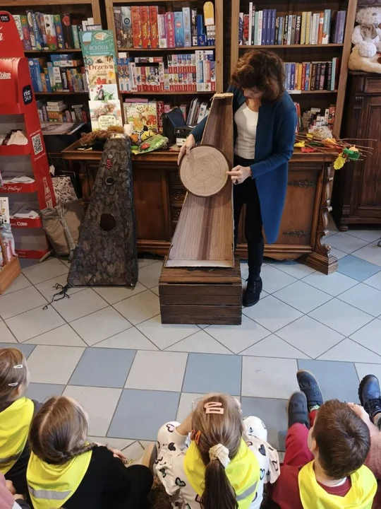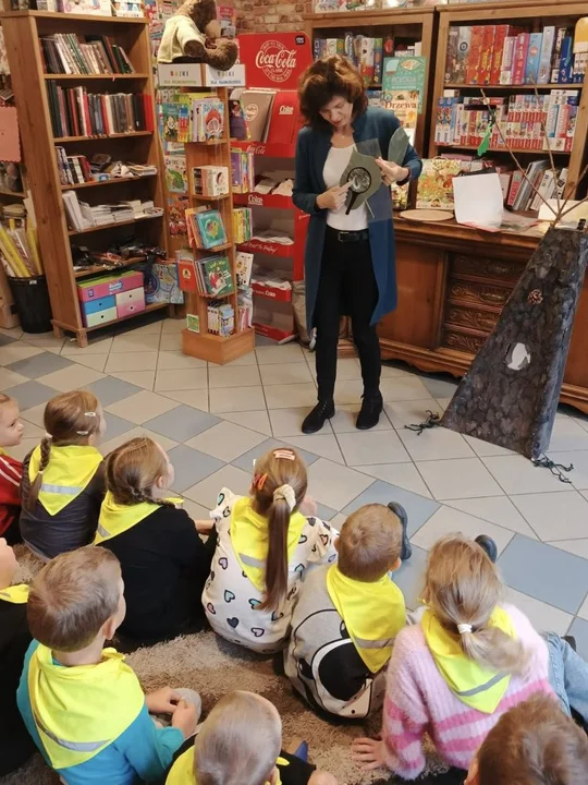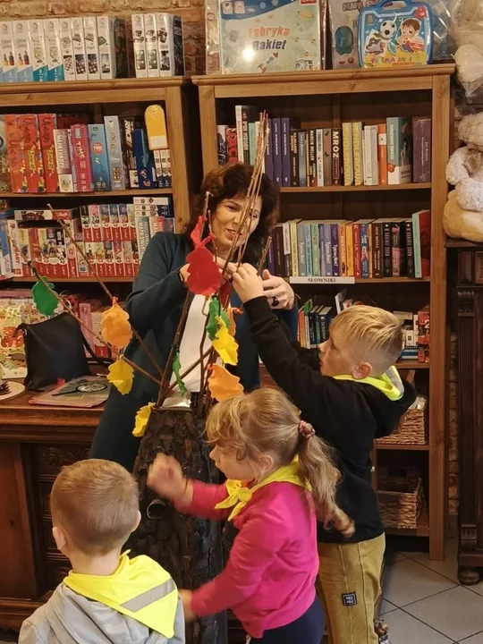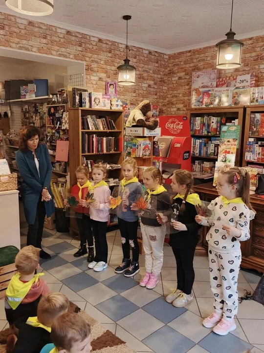 Po leśnych odkryciach przyszedł czas na kolejną atrakcję - wycieczkę do lokalnej księgarni na ul. Paderewskiego w Jarocinie. Tam mali miłośnicy książek uczestniczyli w warsztatach „Drzewo i jego mieszkańcy” prowadzonych przez pisarkę i ilustratorkę Reginę Gruchalską. Dzieci poznawały tajemnice lasu, rozpoznawały gatunki drzew, ubierały jesienne drzewko i uczyły się, jak drzewa oczyszczają powietrze, regulują klimat, dostarczają drewna i leków oraz stanowią schronienie dla zwierząt i roślin.Spotkanie zakończyło się wspólnym zdjęciem i podziękowaniami, a księgarnia po raz kolejny pokazała, że książki i edukacja ekologiczna mogą iść w parze, inspirując najmłodszych do odkrywania świata przyrody z ciekawością i radością.