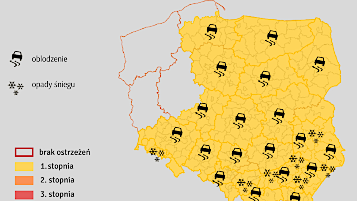 Instytut Meteorologii i Gospodarki Wodnej wydał ostrzeżenie 1. stopnia przed oblodzeniem dla województw: pomorskiego, warmińsko-mazurskiego, podlaskiego, kujawsko-pomorskiego, mazowieckiego, łódzkiego, świętokrzyskiego, lubelskiego i części województwa wielkopolskiego, w tym powiatu jarocińskiego.