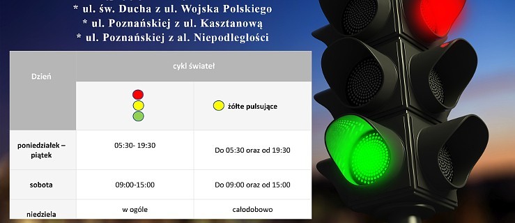 W pozostałym czasie, czyli w od poniedziałku do piątku - do godz. 5.30 oraz od godz. 19.30, a także w soboty - do godz. 9.00 oraz po godz. 15.00 i całodobowo w niedzielę, wprowadzona zostaje sygnalizacja świetlna z żółtym światłem pulsującym.