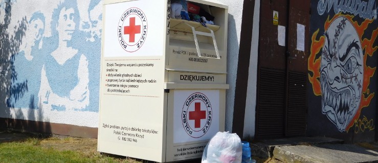 Logo Polskiego Czerwonego Krzyża pojawiło się na pojemnikach do zbiórki odzieży, pościeli, butów i pluszowych zabawek. Coraz częściej dochodzi do sytuacji, że rzeczy są rozrzucone wokół kontenerów.