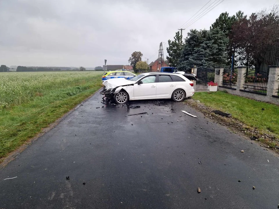 Po zderzeniu volkswagen zatrzymał się na polu, a audi stanęło w poprzek drogi.