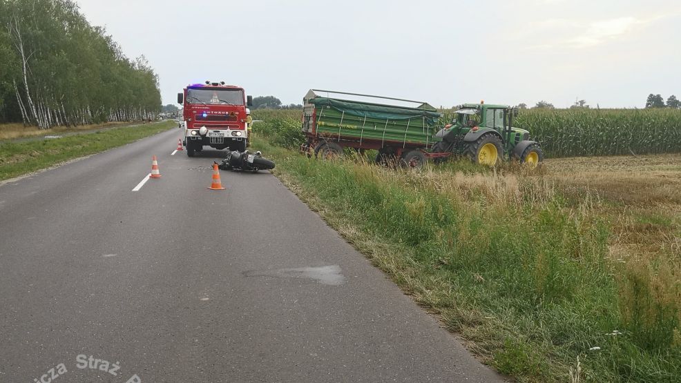 Kierujący motocyklem zderzył się z ciągnikiem. W wyniku tej kolizji motocyklista ucierpiał. Na miejscu pojawił się Zespół Ratownictwa Medycznego, który zajmuje się poszkodowanym. Po wstępnym opatrzeniu podjęta zostanie decyzja, czy motocyklista wymaga dalszej hospitalizacji - informuje oficer dyżurny PSP Jarocin