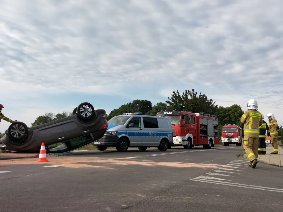 Ze wstępnych informacji wynika, że zderzyły się tam dwa pojazdy. Jedno z aut dachowało. W zdarzeniu ucierpiały dwie osoby. Kobiecie jadącej autem osobowym strażacy udzielili pierwszej pomocy. Została ona zabrana do szpitala przez Zespół Ratownictwa Medycznego.