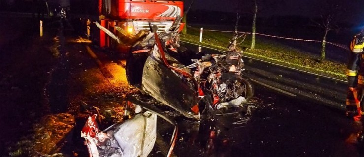 Na prostym odcinku drogi doszło do niemal czołowego zderzenia fiata seicento z ciężarowym renaultem. Osobowe auto zostało kompletnie rozbite. Co gorsza wrak natychmiast stanął w płomieniach.
